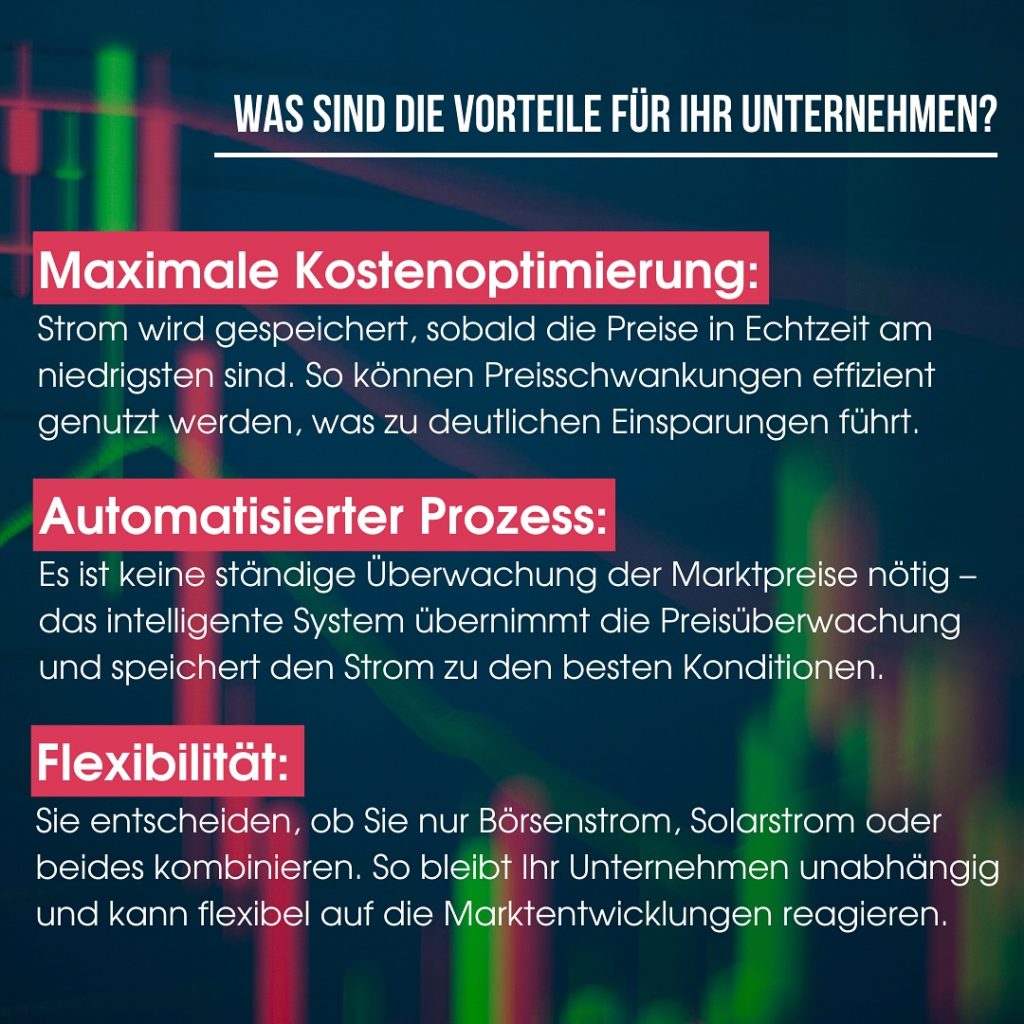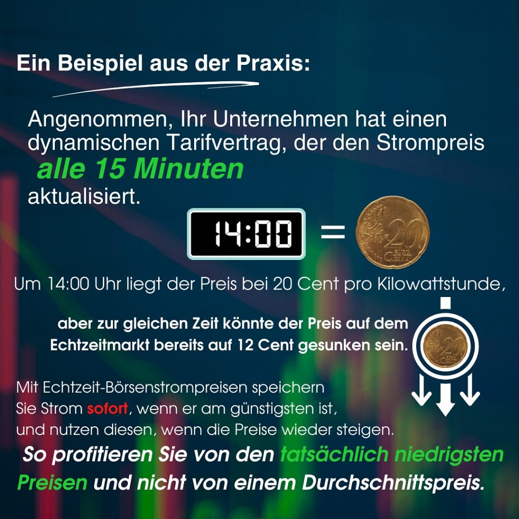 Let’s say your company has a dynamic tariff agreement that updates the electricity price every 15 minutes. At 2:00 p.m. the price is 20 cents per kilowatt hour, but at the same time the price on the real-time market could already have fallen to 12 cents. With real-time stock market electricity prices, you store electricity immediately when it is cheapest and use it when prices rise again. This way you benefit from the actual lowest prices and not from an average price.