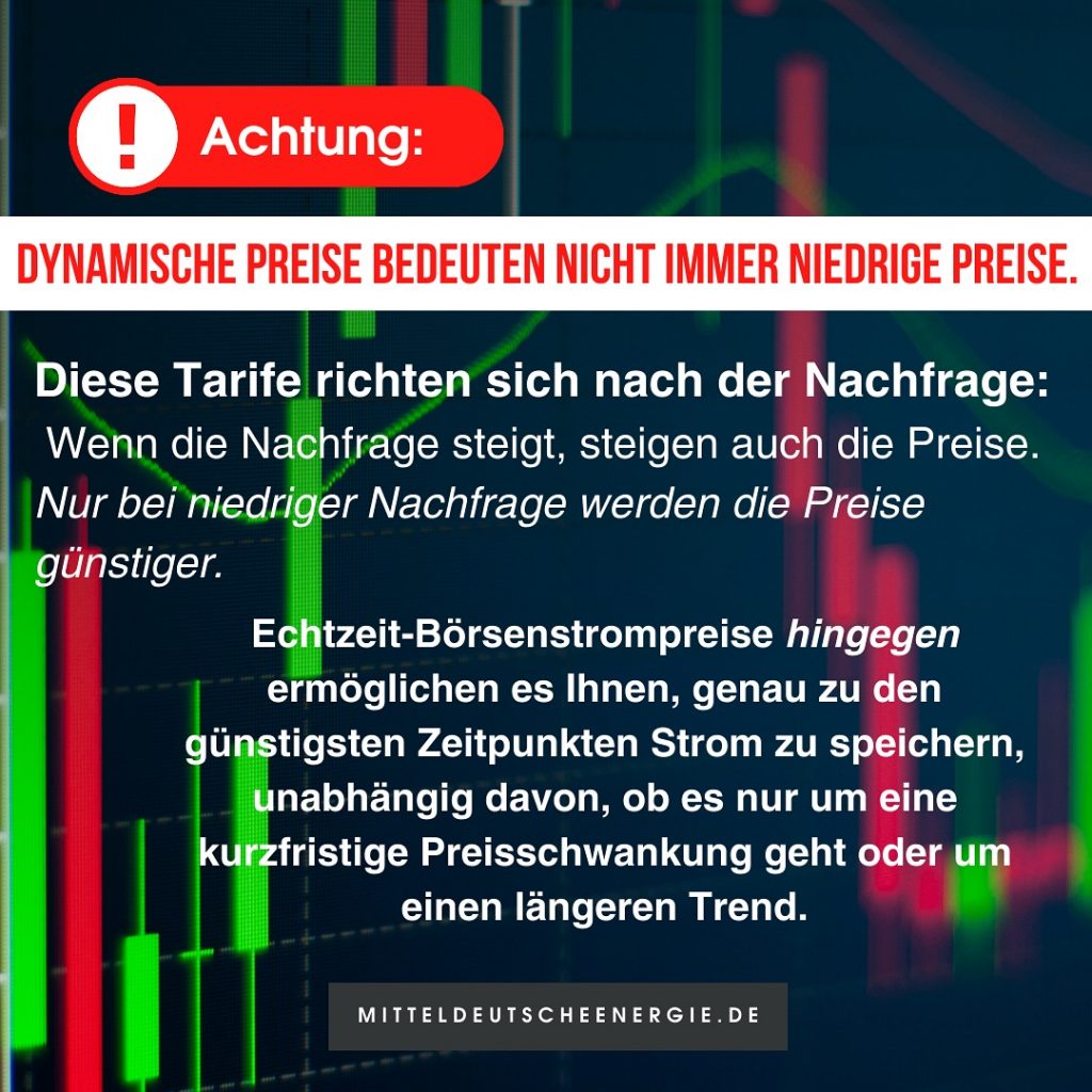 ????Attention: Dynamic prices do not always mean low prices. These tariffs are based on demand: When demand increases, prices also increase. Prices only become cheaper when demand is low. Real-time stock market electricity prices, on the other hand, enable you to store electricity at exactly the cheapest times, regardless of whether it is just a short-term price fluctuation or a longer trend.