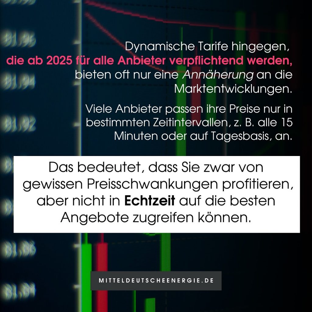 Dynamic tariffs, on the other hand, which will become mandatory for all providers from 2025, often only offer an approximation of market developments. Many providers only adjust their prices at certain time intervals, e.g. every 15 minutes or on a daily basis. This means that while you benefit from certain price fluctuations, you cannot access the best deals in real time.